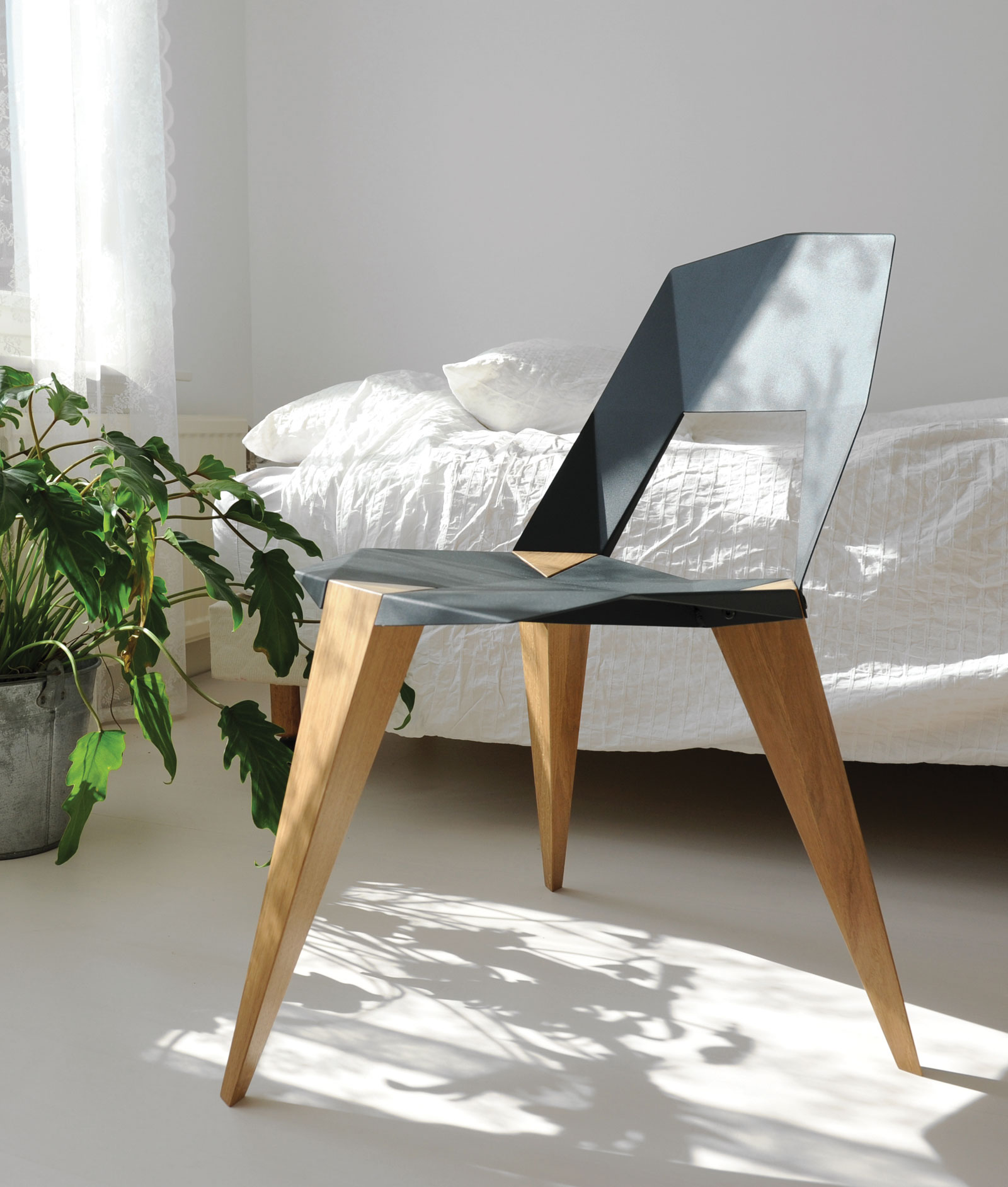 A lightweight flat packing chair made from only three different parts. The triangulated lines on this three-legged chair serve both aesthetics and function, offering a sturdy and comfortable seating experience.